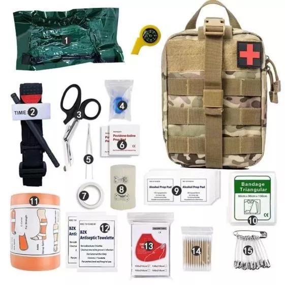 Die Erste-Hilfe-Geräte im einzelnen Erste-Hilfe-Kit haben die folgenden Funktionen: Stoppen von Blutungen, Desinfektion, Binden, Immobilisierung und Analgesie usw. Mit grundlegenden Fähigkeiten erster Haid und die korrekte Verwendung solcher Geräte können Sie um das Überleben der Verwundeten kämpfen und Bedingungen für die Evakuierung schaffen.